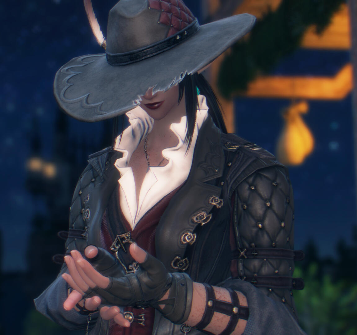 Freckled ashen-grey skin and long and thick black hair, frequently tied up in a loose ponytail. Hanging from her left ear is a small crystalline earring, almost shaped like it were a broken piece of an aetheryte.She always has a burgundy sheen of lipstick accompanied by heavy eyeshadow, with a long and thin scar ranging from the bridge of her nose to just below her left eye.She carries with her a cheerful smile when traveling about, often disarming the assumption of those who would call her unapproachable. Though hidden by a set of tinted shades, she holds a piercing set of crimson eyes with the smallest of wrinkles that hide underneath her lower lids.Spending much of her years as an adventurer, she has numerous scars across her already rosy figure that range from small cuts and bruises to more extensive and older gashes and burns. Each tells a story.Being a woman who prefers the open road, Orielle tends to stick to lighter clothing. Rarely does she prefer the northern weather of Coerthas and Ilsabard, and she instead wears lightweight jackets, coats, blouses, and so on that keep her comfortable.Belts, buckles, and other straps hold together all sorts of hidden pieces of equipment and trinkets on her person. Pouches, bags, and even a knapsack that rests on her shoulders while out in the world carry all sorts of useful items for a self-respecting adventurer.When she's out during the day, she'll be caught wearing some form of protective eyewear, notably a pair of sunglasses that keep firmly on her face. Often, she'll pair said eyewear with an old cowboy hat, frayed at the edges, with a small hawk feather nestled at the top of the aged piece of headwear.Orielle, as a Viper, wields a pair of matching swords known to her order as Twinfangs, each with a pommel functioning as a connecting force and is which allows her swords to turn into a singular polearm. Secured onto her back with matching sheathes, they serve as her primary tool when dealing with monsters of all kinds and sizes.Though her voice has a low and husky rasp, the unmistakable Gelmorran accent slips through the cracks of her vocabulary. Try as she might to mask it through her many years spent in La Noscea, there is little she can do to cover it up.
