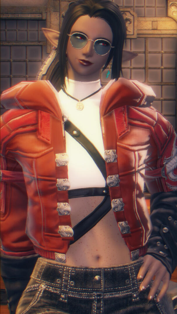 Freckled ashen-grey skin and long and thick black hair, frequently tied up in a loose ponytail. Hanging from her left ear is a small crystalline earring, almost shaped like it were a broken piece of an aetheryte.She always has a burgundy sheen of lipstick accompanied by heavy eyeshadow, with a long and thin scar ranging from the bridge of her nose to just below her left eye.She carries with her a cheerful smile when traveling about, often disarming the assumption of those who would call her unapproachable. Though hidden by a set of tinted shades, she holds a piercing set of crimson eyes with the smallest of wrinkles that hide underneath her lower lids.Spending much of her years as an adventurer, she has numerous scars across her already rosy figure that range from small cuts and bruises to more extensive and older gashes and burns. Each tells a story.Being a woman who prefers the open road, Orielle tends to stick to lighter clothing. Rarely does she prefer the northern weather of Coerthas and Ilsabard, and she instead wears lightweight jackets, coats, blouses, and so on that keep her comfortable.Belts, buckles, and other straps hold together all sorts of hidden pieces of equipment and trinkets on her person. Pouches, bags, and even a knapsack that rests on her shoulders while out in the world carry all sorts of useful items for a self-respecting adventurer.When she's out during the day, she'll be caught wearing some form of protective eyewear, notably a pair of sunglasses that keep firmly on her face. Often, she'll pair said eyewear with an old cowboy hat, frayed at the edges, with a small hawk feather nestled at the top of the aged piece of headwear.Orielle, as a Viper, wields a pair of matching swords known to her order as Twinfangs, each with a pommel functioning as a connecting force and is which allows her swords to turn into a singular polearm. Secured onto her back with matching sheathes, they serve as her primary tool when dealing with monsters of all kinds and sizes.Though her voice has a low and husky rasp, the unmistakable Gelmorran accent slips through the cracks of her vocabulary. Try as she might to mask it through her many years spent in La Noscea, there is little she can do to cover it up.